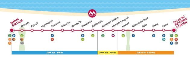 Derzeit verkehrt der Metromare auf der Strecke von vom Bahnhof Rimini FS zum Bahnhof Riccione FS. Sie umfasst 15 Zwischenstopps und läuft alle 15 oder 30 Minuten je nach Zeitfenster (im Allgemeinen häufiger zwischen 8:00 und 22:00 Uhr an Wochentagen und von 9:00 bis 21:00 Uhr an Feiertagen).