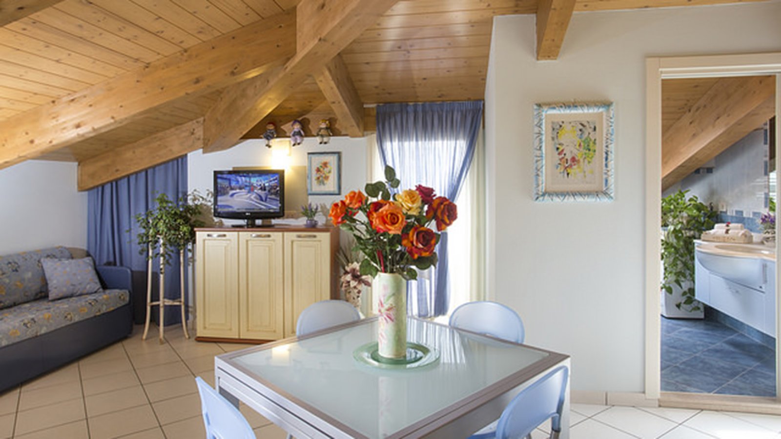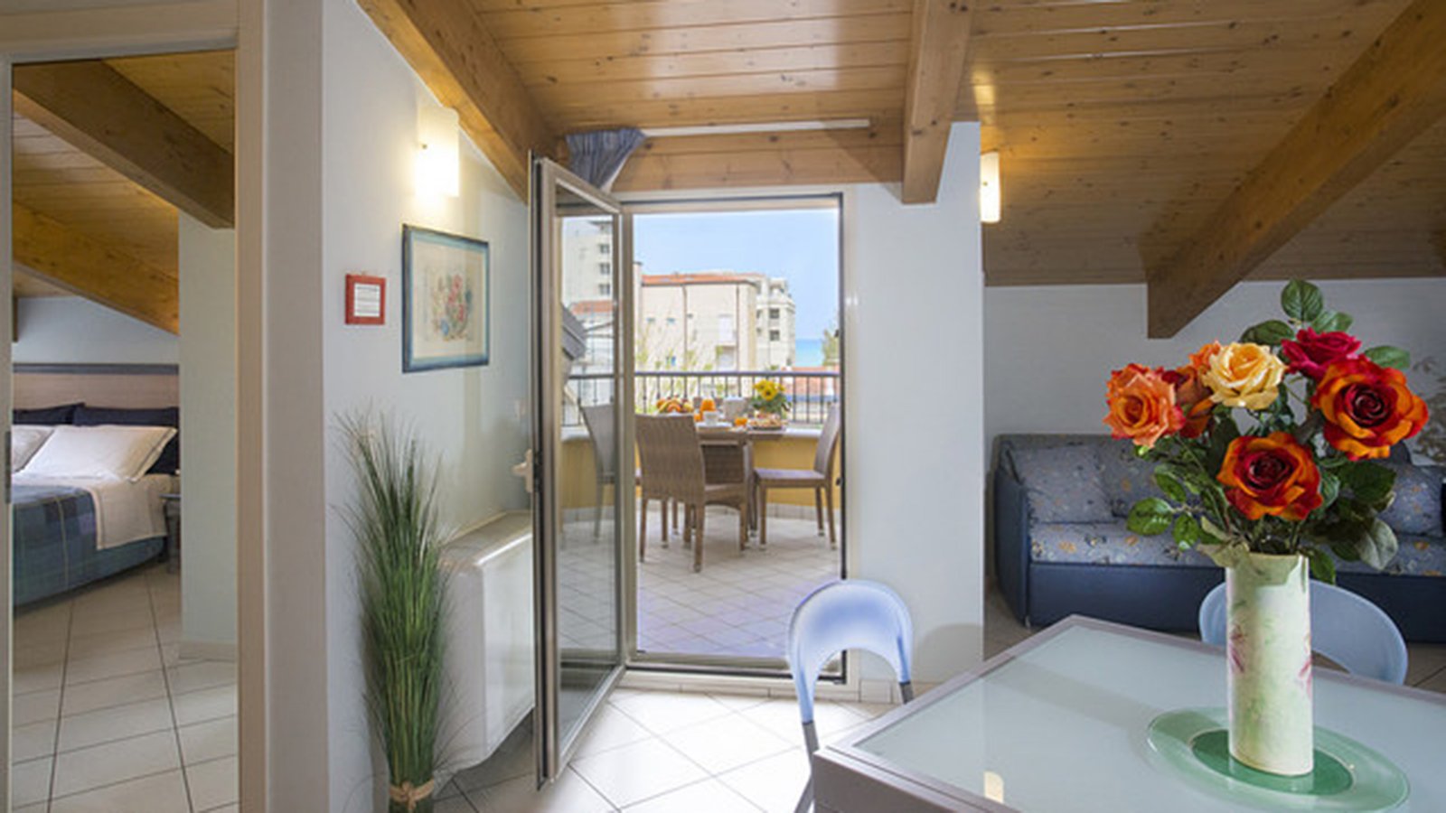 APPARTAMENTI INDIPENDENTI. La struttura dispone di 11 appartamenti recentemente ristrutturati, identificati da nomi di pietre preziose (Turchese, Ambra, Corallo, Acquamarina, Topazio, Giada, Perla, Smeraldo, Zaffiro e Rubino). Gli alloggi possono ospitare da 3 a 5 persone e offrono balcone arredato, climatizzazione autonoma, cassaforte, Smart TV con canali Sky e Wi-Fi in fibra a 200 Mbit/s. La dotazione comprende lenzuola, biancheria da bagno e cucina, teli mare, con servizio di pulizia giornaliera disponibile su richiesta.